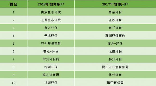 结合2017年政务微博排名:贝博艾弗森官网 发现这两年@南京生态环境、@江苏生态环境、@宜兴环保始终占领着前三的宝座,无人超越;@无锡环保、@苏州环保宣教、@宿迁-环保不分上下;2018年更有位新进宠儿@常州环保局脱颖而出;逆水行舟,不进则退,作为过去几年曾名列前十的政务微博 ,想必仍有不小的期许。