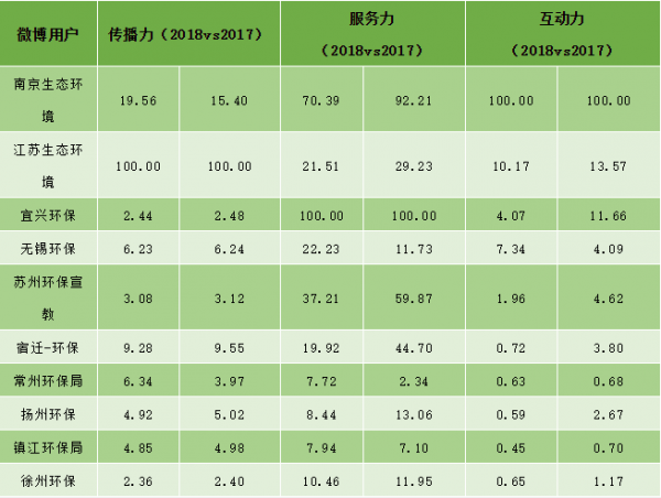 从榜单中可以看出:@南京生态环境、@江苏生态环境和@宜兴环保之所以可以蝉联夺冠,这与他们三项指标至少保持一个名列第一密不可分;@无锡环保、@苏州环保宣教和@宿迁-环保的较劲基于三项指标不分上下;新秀@常州环保局明显在“传播力”和“服务力”上狠下了功夫;@昆山市环境保护局的惜败,不是空穴来风,仅“传播力”维持不变,其余两项普遍较2017年降低不少,不过,只要下功夫,在2019年赶超前三也是有可能的。