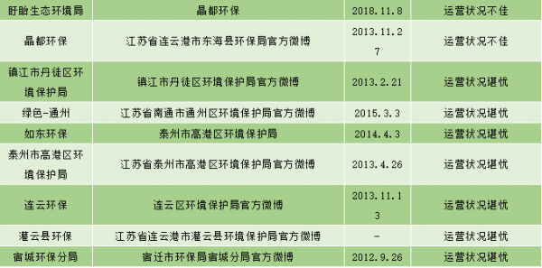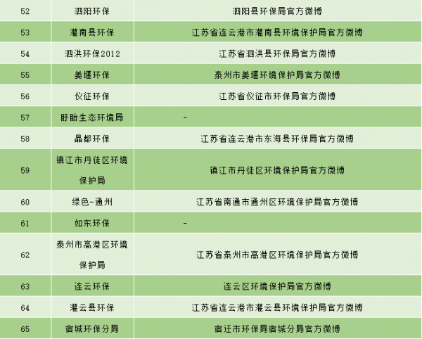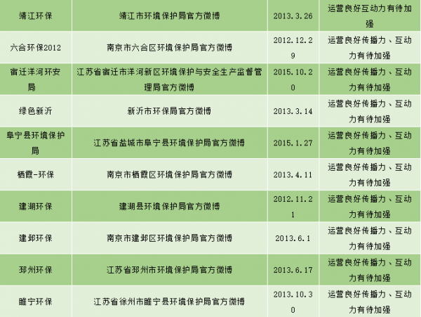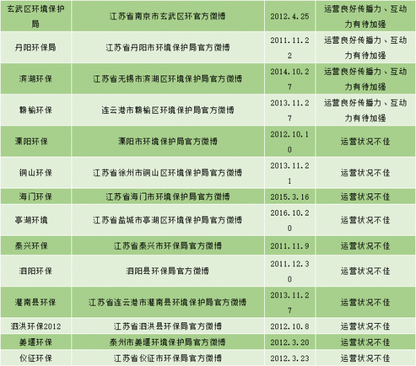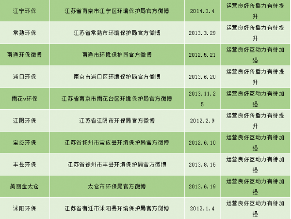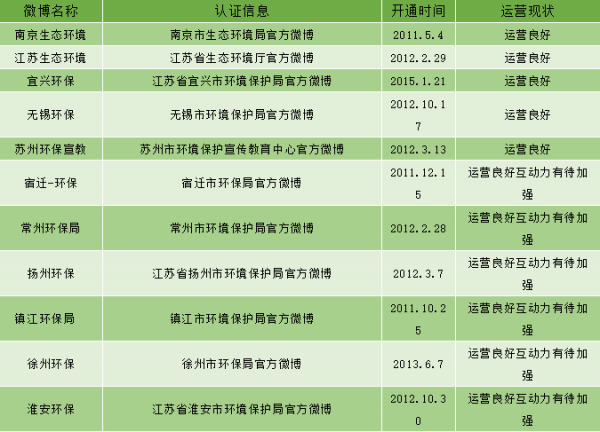 江苏省已经有65个(省级1个,市级13个,县市级51个)经过新浪微博认证的环保政务官方微博,目前大多数环保部门加入政务微博的行列,可萌可做事,巩固了自身的公信力,但不乏在已认证的环保政务机构中,有已经荒废或停止微博运营的,贝博艾弗森官网