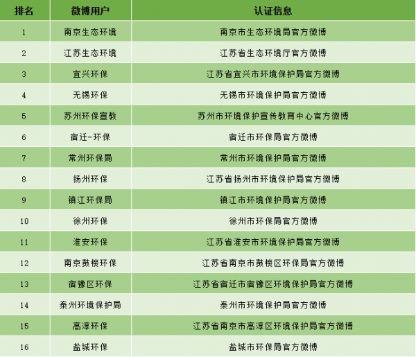 说明:此次江苏省环保政务微博排名仅供参考,如有不足之处,烦请不吝指正告知贝博艾弗森官网公众环境关注中心。