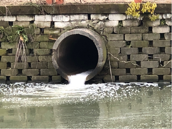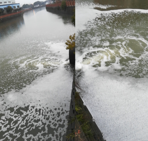 图3 雨水管道排放废水的河面富集大量白色泡沫
