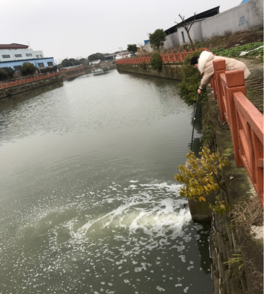 接到举报后,贝博艾弗森官网工作人员曾多次前往江阴市顾山镇北川路河道附近进行调研,发现该雨水排口非雨天向河道长时间排放大量废水,排放时间集中在晚上和周末的下午3时至6时。排水时河面大面积富集大量白色泡沫,泡沫漂浮河面长时间不散。2019年2月16日贝博艾弗森官网工作人员现场采集水样,pH试纸检测结果为3呈强酸性,现场可以明显闻到刺鼻的味道。现场情况如图2~5 所示。