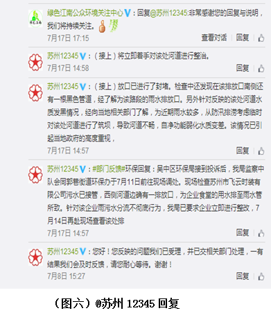② 苏州12345:7月8日苏州12345受理了@贝博艾弗森官网公众环境关注中心的微博举报,7月17日回复:#部门反馈#环保回复:该河道水质发黑情况已引起当地政府高度重视,将立即着手对该河道进行整治。同时吴中环保局监察中队已对河道周边企业进行排查,确保企业无生产废水进入外环境。