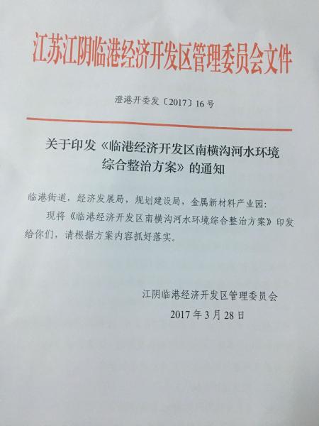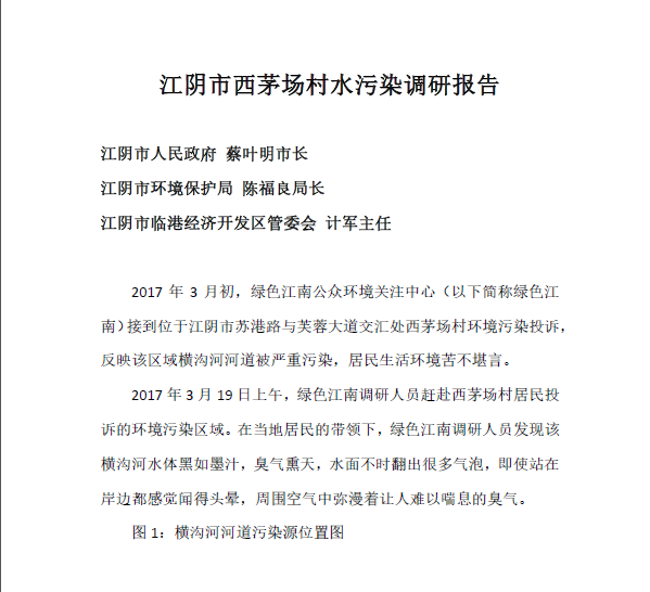 贝博艾弗森官网根据污染源实地调研情况向江阴市人民政府、江阴市环境保护局、江阴市临港经济开发区管委会寄出了《江阴市西茅村水污染调研报告》,期待在水环境整治方面能与相关部门密切合作,共同推进“263”专项行动。