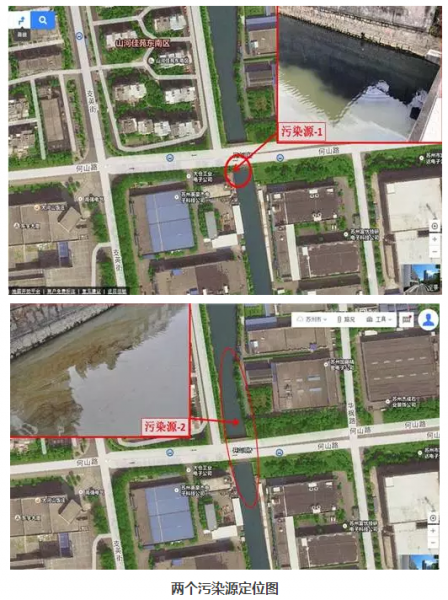 污染源—2则是与何山路形成了交叉,从开山河桥的南面延伸到了北面,逼近居民区。与污染源—1不同,污染的河道呈黄锈色,同时浮有油污。
